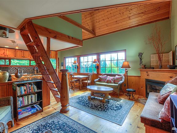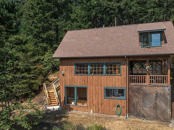 Retreat to a peaceful Doe Bay cabin sanctuary. This 949.5 square foot home on 5+ acres is nestled into the hillside. Large south-facing windows and vaulted ceilings provide nice light and a partial water view. One bedroom, a bonus room, a separate loft, and a full bathroom (remodeled in 2008) allow you to live large within the modest square footage. The partially finished basement provides a laundry and storage area. A large hot tub is surrounded by nature and sheltered on the large covered deck. Private garden space among fruit trees and a tranquil pond, protected within the fully fenced area. Outbuildings on the property include a large 864 sqft steel shop, a 140 sqft finished studio with power, 2 rustic potting sheds, and a "treehouse".
