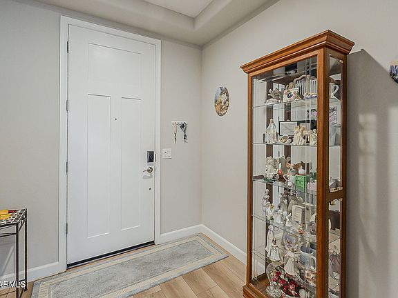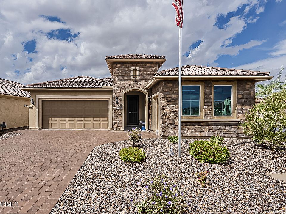 Beautiful 2 bed, 2.5 bath home in a prestigious 55+ community with 2-car garage plus golf cart garage. Features include 9' ceilings, recessed lighting, plantation shutters, water softener, tankless water heater, and added insulation. Chef's kitchen with island, double wall ovens, KitchenAid dishwasher, built-in microwave, soft-close cabinets with pull-outs, and all appliances included. Primary suite offers built-in desk, California closets, walk-in shower, dual vanities, and private toilet room. Office, laundry with washer & dryer, and spacious covered back patio complete this move-in ready home.