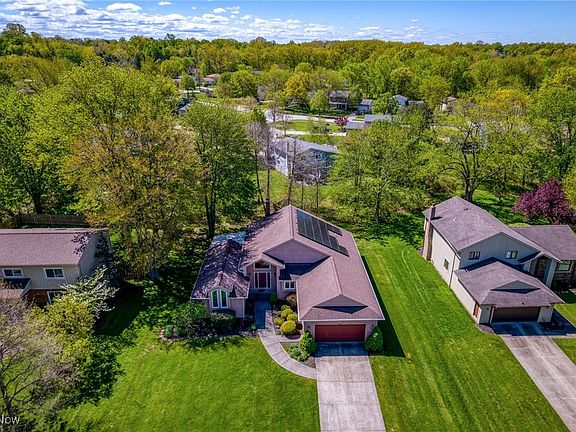 Fabulous 3-bedroom, 2 full bath contemporary Ranch on this highly desired cul-de-sac street in Richmond Heights. Great curb appeal and Richmond Hts. compliant! The two-story foyer opens to and amazing great room with vaulted ceilings, floor to ceiling fireplace, Palladian windows, expansive formal dining room and sliding doors leading the delightful, enclosed patio. The large eat-in kitchen offers lots of cabinetry, counterspace, all appliances (new refrigerator 2023) and roomy dinette area. Fabulous owner suite has vaulted ceilings (new ceiling fan 2025), walk-in closet, double closet and a large glam bathroom with double vanity, soaking tub and separate walk-in shower. At the opposite side of this great home, you will find 2 additional good-sized bedrooms, full bath #2, and the 1st floor laundry room. Large basement with glass block windows, waterproofed by Ohio State waterproofing with extended renewable warranty at $50 per year and new built-in Aprilaire dehumidifier added 2024. 2 car attached garage! Large yard with landscaped flower beds. Additional highlights: backup generator, water purifier, triple pane windows with UV protection. Solar panels. Great location! Close to the new Belle Oaks Market Place, Hilltop Plaza and many other great shops and restaurants.