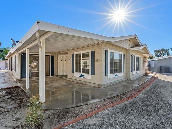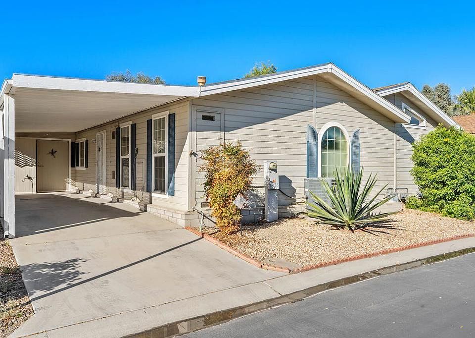 Discover this manufactured home on a permanent foundation, nestled in the prestigious Coronado Gardens community. Enjoy resort-style living with walking paths, a spacious clubhouse, pool and spa, sports court and putting green. This home features a large, covered patio perfect for relaxing. Step inside to a bright, open formal living area with a cozy fireplace and a sliding door leading out to the patio, creating the perfect retreat. The family room has abundant windows and seamlessly connected to the formal dining room. The kitchen features a brand new dishwasher, tile countertops, a pantry with pull-out cabinets, and a large window over the sink. With two generous bedrooms, including a master suite with ample closet space, a dressing area, and a separate tub and shower. An additional office/bonus room has been added and provides flexibility for work or hobbies.Additional highlights include a carport that easily accommodates two vehicles and an oversized workshop with plenty of shelving for storage or projects. This property is located close to shopping, hospitals, and more. Don't miss your chance to experience the best of 55+ living in Coronado Gardens.