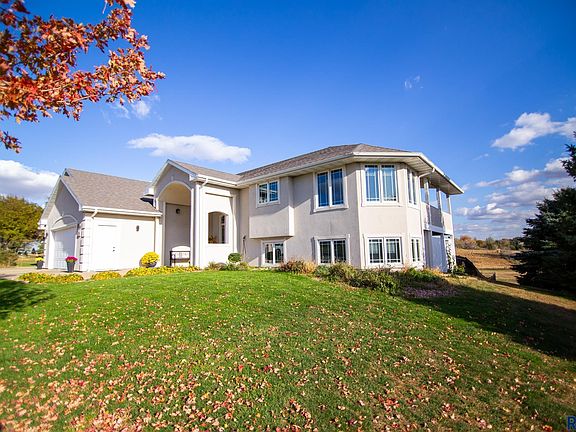 Stunning and elegant country estate is located in the coveted Twin Creek development, set on 2.27 acres with uninterrupted, breathtaking views of rolling hills and a peaceful creek. This custom split-foyer walkout offers refined living just minutes from Sioux Falls and Harrisburg with a unique layout that is anything but cookie cutter. The main level features hard-wood floors with a cozy family room and a spacious primary suite with tray ceiling, two walk-in closets and a luxurious en-suite bath. The second bedroom has access to a full-bath as well as a private entrance to the garage. The gourmet kitchen includes Dakota cherry cabinetry, granite counters, JennAir downdraft cooktop, large island, and walk-in pantry along with newer stainless steel appliances. Enjoy panoramic, serene views from the formal dining room and covered deck. A laundry room has a folding area and plenty of cabinetry for storage. The lower level boasts a large great room with gas fireplace, full wet bar, bedroom, ¾ bath, and flexible game room that could be converted into a 4th bedroom. Outside, relax on the patio with a hot tub and partially fenced yard, enclosed with a premium iron fence that doesn't obstruct views. Updates include a new top of the line efficient HVAC system installed last summer, several new windows, granite countertops, newer appliances, new carpet and vinyl in '21 and a radon mitigation system. An oversized 3-stall garage with water taps and floor drain completes this exceptional property. This is a very solid and well-maintained home!