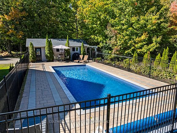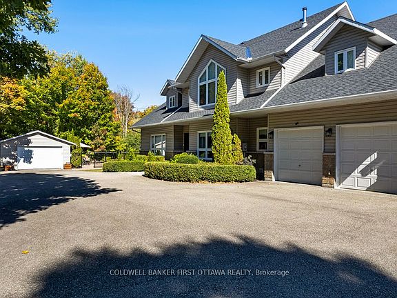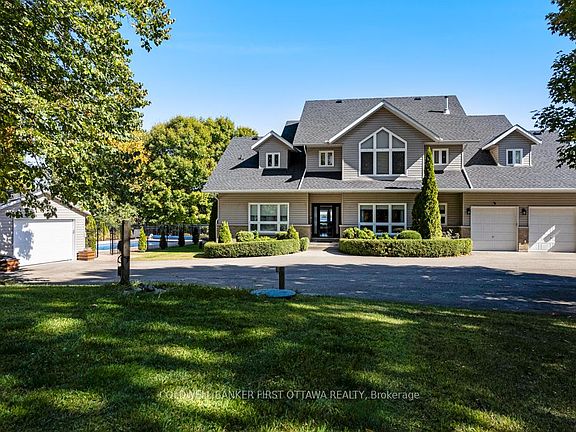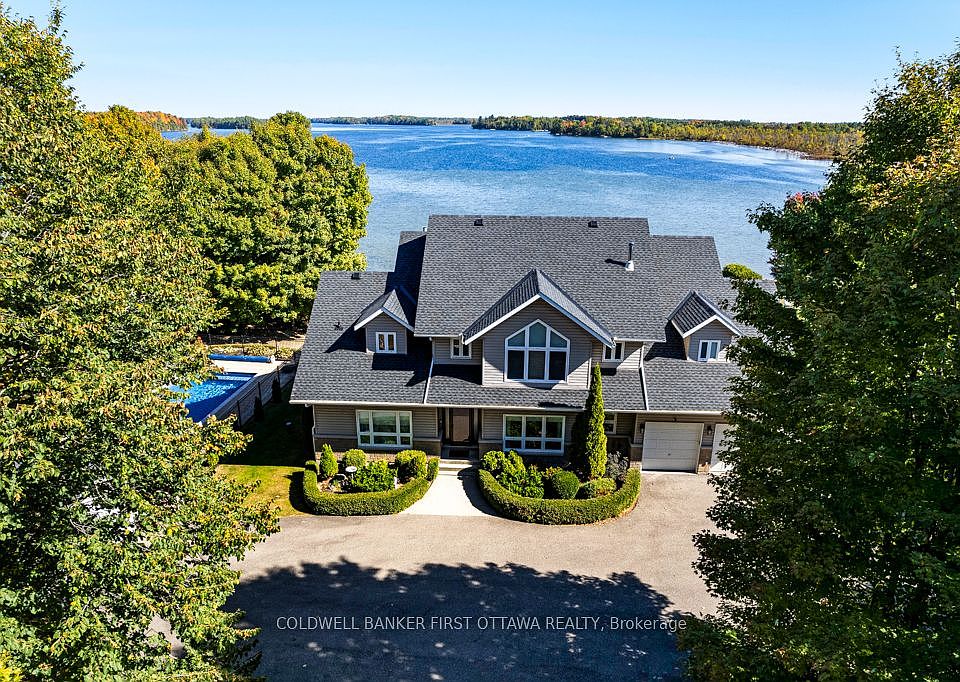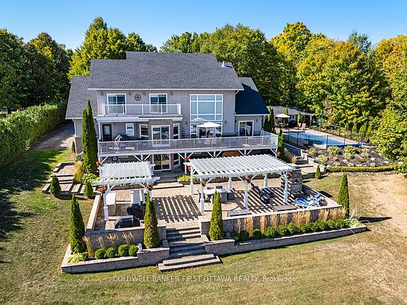 Harmonious curb-appeal of this home is only the beginning of the luxury lifestyle it promises. With 3.8 acres on Otter Lake, spacious 5+2 bedrm, 5 bathrm walkout home has attached double garage & single garage. Surrounded by exquisite landscaping and resort-like amenities, every detail of the home is impressive balance of refined elegance and family comfort. Foyer's cathedral ceiling, along with ceramic floor & closet, creates grand entry. French door opens to den for quiet times. Livingroom 18' ceiling and showcase wall of windows with magnificent lake views, including inspiring sunrises. Centering the room is soaring floor-to-ceiling stone propane fireplace. Patio doors open to expansive deck for continuous outdoor living. Dining room set into windowed alcove, with sunrise views over lake. Dining room open to kitchen, with patio doors to deck. Warmly welcoming kitchen has select maple cabinetry, quartz counters, subway backsplash, breakfast bar & desk station. Laundry room full of conveniences with sink, cabinets and folding counter. Main floor light-filled primary suite has double closet, all updated 2022. Luxurious 5-pc bathroom features dressing room with amazing wall of custom closets, quartz two sink vanity and separate area for soaker tub plus glass shower with body spa spray. Upstairs four bedrooms, two with patio doors to balcony. Second floor 3-pc bathrm & 4-pc bathrm. Walkout lower level family room and two bedrms are above ground for airy bright spaces. Lower level media room and 3-pc bathroom. Expansive lower patio extends into two symmetrical pergolas, one for lounging in front of a fireplace and other for dining with outside kitchen. Inground 2021 heated salt-water pool. Sauna & hot tub. New 2024 architectural roof shingles. New 2023 auto Generac. Kodiak 2022 storage shed. Waterfront 150', approx 5' deep at end of dock. Hi-speed & cell service. On township maintained road with mail delivery, garbage pickup & school bus. 20 mins Perth or Smiths Falls.
