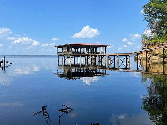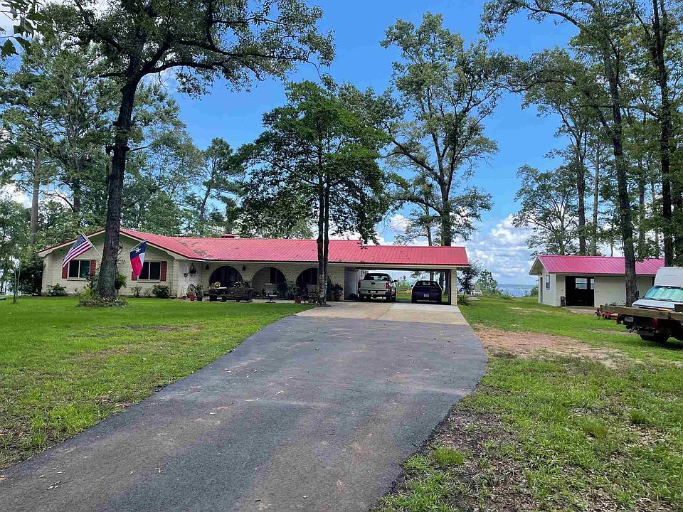 This fabulous waterfront property has a panoramic view of Toledo Bend that's jaw dropping! Situated on 9.12 acres of mature pines and hardwoods and over 1,200 ft of water frontage, this charming 3/2.5 brick home has many upgrades including new ceramic tile and wood flooring. Oversized laundry room w/ half bath, a large family & living room with a brick FP, sunroom,large bedrooms. Outside, there is an attached 2 car carport, 3 car det. garage with built in shelving, a 20x26 tractor implement shed or for boat stg, a custom woodshop with a/c that has views of the lake. A 30x48 boat dock with 2 lifts and a cleaning station, accessed by a new treated walkway that's wide enough for a golf cart and there's a metal staircase leading to a separate boathouse in your very own private cove that leads out into the famous "chicken coop". There is an entirely separate septic system and utilities on the grounds for a mother-in law residence or for guests. Gated entrance and property entirely fenced.