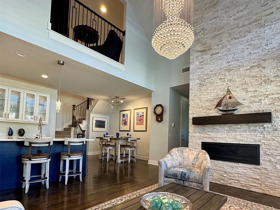 Stone fireplaceEpoxy floorEngineered flooringBuilt in cabinetsLarge game roomMaximize storage and convenienceMarble counter tops