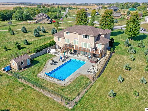 Accepting back up offers. Nestled on a 2.61-acre treed lot within a peaceful neighborhood, just a convenient 20-minute drive to downtown Omaha. The home boasts two master bedroom suites, two additional bedrooms, and a total of six bathrooms, providing ample space and privacy for families or those who love to entertain. The large finished basement includes a media room, adding even more versatility. One of the highlights is the large in-ground pool, which serves as the centerpiece of the backyard oasis. It’s surrounded by a large deck, perfect for relaxation and outdoor gatherings. For car enthusiasts, there's both a 3-car attached garage, and a separate 3-car detached garage, ensuring ample storage and parking space. The rooms throughout the home are generously sized, allowing for flexible layouts and a seamless flow. Recent upgrades during 2023-2024 include a Class 4 shingle roof, all-new gutters and downspouts, and most windows replaced by Pella.