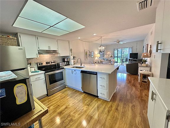 MOTIVATED... A readymade VERY ACTIVE 55+ condo residence, vacation residence. Discover the epitome of TURNKEY perfection. From its centrally located community, this condo boasts many features and COMMUNITY ACTIVITIES that elevate it to the pinnacle of SWFL condo living. Be captivated by the first floor landscaped front entry elevation view with a lush lawn not hindered by any structures near. IN OTHER WORDS A NICE VIEW!! Entering the condo, the GREAT ROOM FLOORPLAN, BATHEDF IN NATURAL SUNLIGHT from the Eastern front windowing and Western Rear lanai and POOL COURTYARD, showcases a MODERN, UPGRADED KITCHEN, TASTEFUL FURNISHINGS which includes a LIVING ROOM SLEEPER SOFA extending bedding capacity and a CHARMING BREAKFAST SETTING. The kitchen has EXPANSIVE QUARTZ COUNTERTOPS, a BREAKFAST BAR a TILED BACKSPLASH, a STAINLESS APPLIANCE PACKAGE, and a PANTRY. From the condo entry, transitioning into and throughout the great-room, is continuous wood-like flooring. The kitchen et al. eludes functionality. A utility closet features a stacked washer and dryer. The Master suite boasts a Queen bed, a bath with a new mirrored vanity, and an upgraded tiled shower. The split bedrooms offer a second bedroom with Queen bedding. The upgraded second bath is directly outside its second bedroom with a new vanity, mirror and fully tiled shower. Enjoy upgraded NEW PLUMBING and FIXTURES, NEW AIR CONDITIONER CHANGEOUT, NEW APPLIANCE PACKAGE, and NEW WATER HEATER along with the caring maintenance by owners. This first-floor condo building has a NEW ASPHLT SHINGLE HURRICANE-INSTALLED ROOF.