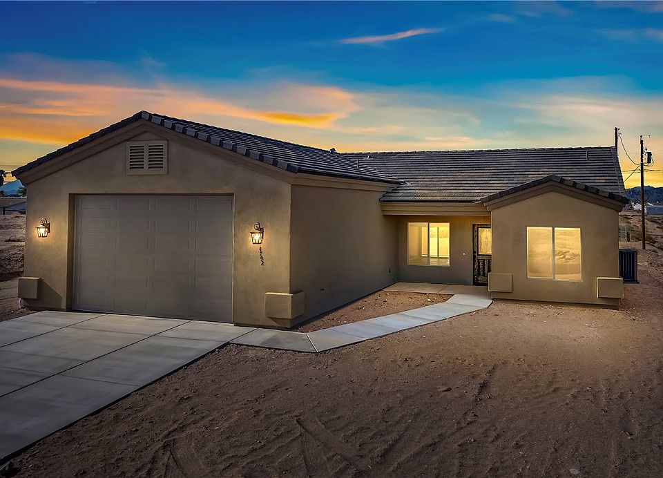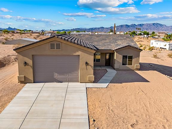 What an amazing opportunity to own a new home in Topock/Golden Shores! This 3 bed 2 bath site-built home is sitting on just over a quarter-acre lot with a great location & unobstructed views. Truly a blank slate outdoors to customize just to your liking, with a covered patio ready for you. Just minutes from gas stations, restaurants, and more, this home has it all including the best feature: a 30 foot deep by 25 foot wide garage with a 10 foot door. That's right, boat and toy enthusiasts, this home was made for you. Need to fit the boat but the woman in your life needs a home with modern upgraded features? You're covered. Wood-look tile flooring throughout, striking stone counters, tile walk-in shower, stainless steel appliances including refrigerator, attractive neutral paint colors, indoor laundry with washer & dryer, large primary walk-in closet, & more. You won't be disappointed with the quality of this build and the craftmanship of the work. The layout features a split floorplan to keep privacy for the primary suite. Home has a total of 1,394 sq ft of living space and the land has a total of 11,761 sq ft of lot space. This property is move-in ready and waiting for you to come live the river life - you're right by access to the marsh as well as the river and gorge area. The perfect vacation home, permanent residence, or retirement haven!