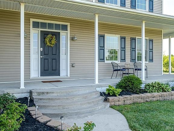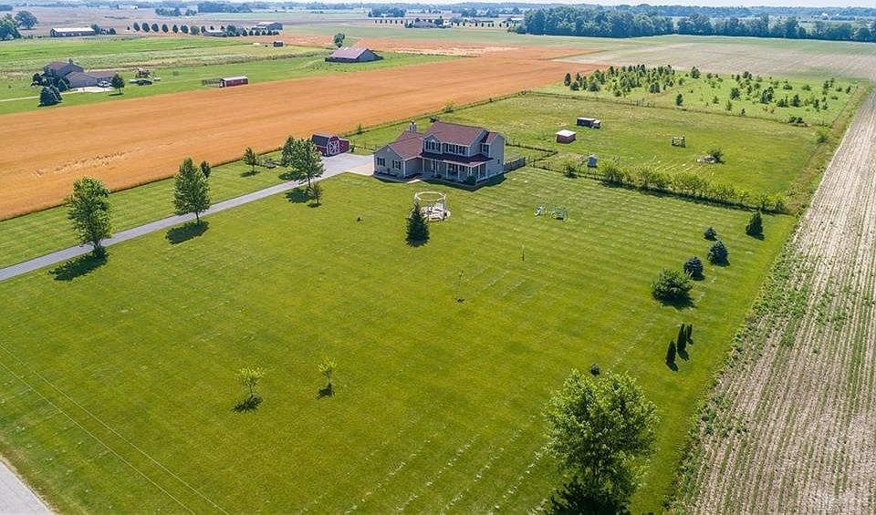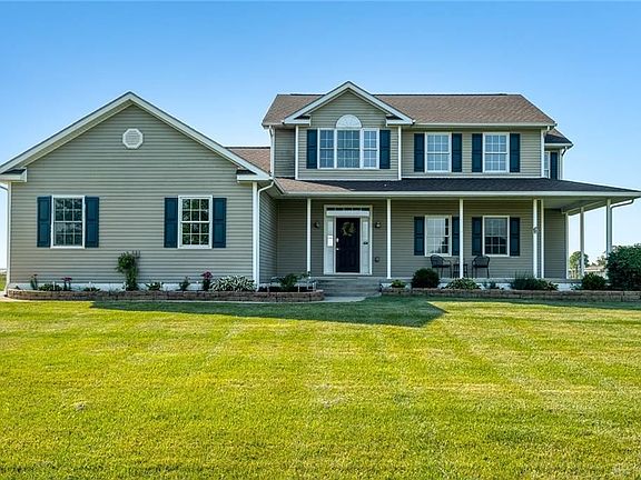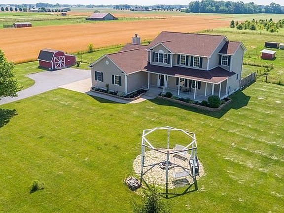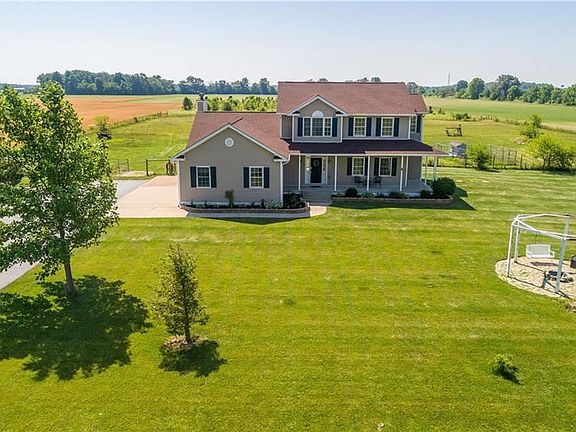 Wonderful country property situated on 6.75 acres. Beautiful views from front porch and back deck. This 4 bedroom home built in 2008 offers open kitchen to dining area and large great room featuring a stone woodburning fireplace. Acacia wood floors on main level. Kitchen has corian countertops, hickory cabinets, island bar, stainless steel appliances. Half bath on main level. Main suite on 1st level with large walk-in closet & full bath, the 3 tier stair case leads to upper level with 3 bedrooms and 1 full bath. Second floor also offers large walk in closet. New carpeting on stairs and upper level 2022. Ceilings on 1st level 9' high. Full unfinished basement plumbed for 4th bath. 2.5 car garage attached. New roof 2020, Asphalt drive way sealed in 2021. 200 AMP service. 20 x 16 shed with loft in main section. Geo Thermal heating & cooling installed. Wired for a security system. Just minutes from Rt 35 By-pass so easy access to I71, WPAFB, schools and shopping.