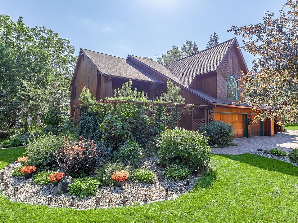 This zen-inspired home on the Cass Lake Chain rests on Wolf Lake. Here you will find a meticulously maintained property 1+ acres & 150 feet of lakeshore that ensures ample space for outdoor living & activities, to include patios, a dock, gardens, & serene water features. As you enter the home, notice the bamboo flooring that flows into tile. The main floor features a gorgeous foyer that greets you into a great room & formal dining room, all giving views of the lake. As you walk up the gallery staircase you will find french doors that open up into the primary bedroom, including a private screened-in porch, 2-sided fireplace & custom en-suite with more views. Walk down the hall to find a small studio with its own balcony, a 2nd bedroom & a full bath that leads into bonus living. This living space includes a kitchenette, loft, & separate entrance. The basement gives you a new perspective of the lake, with a handsome study, spa-like bathroom & walkout bedroom.