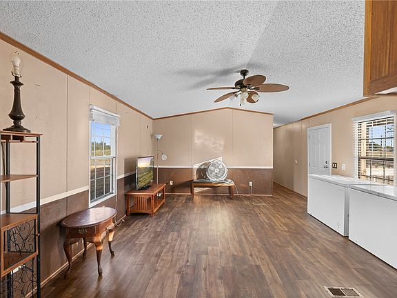 Unlimited potential on this 1.61 acre tract. Existing 1216 sf 3 bed 2 bath mobile home and a 40' x 80' slab with all utilities in place. Build your home or a business. Located on a main intersection for easy access. Yard has pipe fence and access from multiple side.
