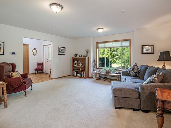 Enjoy country living on this peaceful estate on private lane, 5 acres 7 minutes from town. A forest sanctuary surrounds this 4 bed 2.75 bth home w/ wooded views from all windows. Cozy floor plan w/ one bedroom/ office downstairs, large bright kitchen is open to family room w/ Lopi wood stove. Entertaining wildlife, fruit trees & wild berries abound. Master suite w/ walk in closet, jacuzzi tub & private deck. 2 car attached garage & Detached 30x60 shop w/ heated office & 2 lofts. Storage galore!