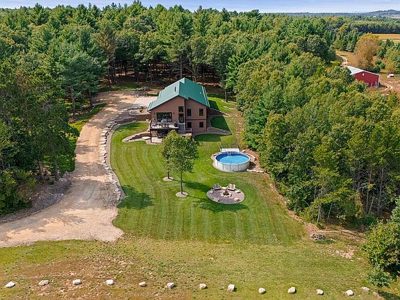 An unparalleled, serene, executive residence tucked on nearly ten wooded acres overlooking peaceful terrain. This 4 bed, 3 bath property features a quiet setting with pristine landscaping. The heated 2.5-car garage connects to a welcoming foyer near the mudroom and main floor laundry. The kitchen boasts granite countertops, hickory cabinets, and stainless steel appliances. Seamlessly transitioning into the living room, enclosed by large fiberglass windows, a custom wood-burning fireplace creates a cozy and inviting ambiance. The master suite showcases a cedar-lined ceiling, walk-in closets, and a private bathroom hosting a whirlpool tub. Downstairs includes a family room, wet bar, three bedrooms, and an exercise room. The east-facing deck and walk-out patio cap off an unmatched homestead!