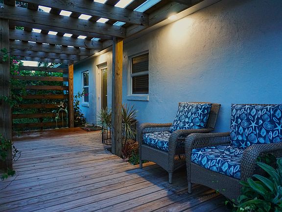 Exterior: The house features a charming, well-maintained exterior with tropical landscaping, including palm trees and lush greenery. A driveway provides off-street parking, and there is a small front porch and back patio area where you can enjoy your morning coffee.