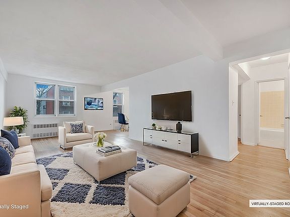 This spacious bright one bedroom coop features a windowed updated eat-in kitchen; the very large living room and king size bedroom have large windows facing the front of the building each overlooking open charming views. There are beautiful hardwood floors throughout the apartment, a modern full bathroom; great closet space. Monthly maintenance $858.50 includes heat, water and taxes. Temporary monthly assessment: $117.05