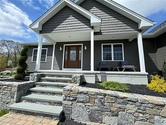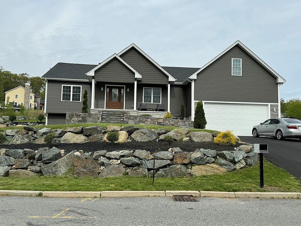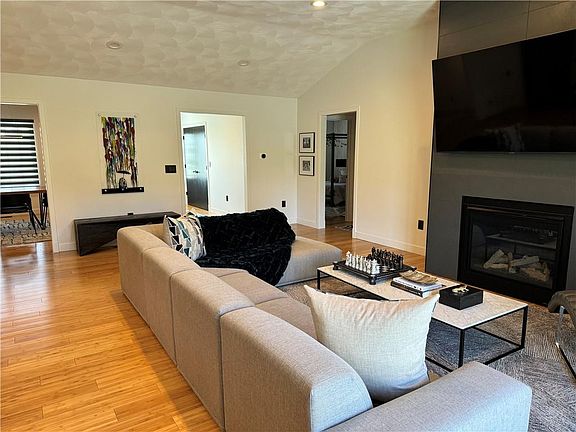 Better than new! This pristine gem has over $40,000 of upgrades, and all in a neutral color palette. Hardwoods, tile, custom window treatments, understated modern lighting, and everything just two years old! This spectacular open plan ranch in Falcon Nest Estates offers a stunning kitchen with smooth panel European style gray cabinetry and quartz countertops. The large island/breakfast bar seats five easily, and provides all the prep space you need. Top of the line, smudge proof, Bosch black stainless appliances. Gas range highlighted by a stunning, full height, matching quartz countersplash and convenient pot filler. All this is open to the living room, which features a dramatic floor to ceiling, custom tiled gas fireplace, and large dry bar with beverage fridge. Off to the side is a huge dining room with exquisite contemporary lighting. The very private primary suite has a generous walk in closet and the luxurious bath of your dreams. A free standing, extra deep soaking tub, heated towel bars, double vanity with deep vessel sinks, and an XL stand up shower. Two more bedrooms and a common bath are on the other side of the living area. Dedicated laundry room, two car garage. Enormous full basement with walkout adds 2000+ square feet of potential living space. Exterior is maintenance free, starting with the brick walkway and beautiful bluestone steps, leading to a covered front porch, sprinklers. All this with city water & sewer, natural gas, underground utilities.