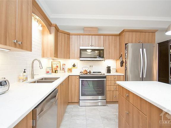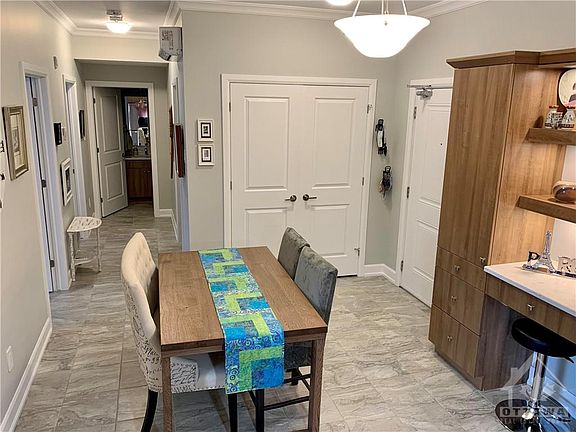 Three storey building with elevator. Gorgeous top floor with nine foot ceilings; two bedroom condo with radiant heated flooring throughout is priced to sell! Upgrades include quartz counters in kitchen, kitchen island and bathroom, sinks, faucets and backsplash. Additional tall cabinets with a desk niche in kitchen. Crown moulding throughout. Large front closet, full size washer/dryer, high end kitchen appliances. The Carrière air conditioning unit is quiet and superior quality ceiling fans each have a remote control. South facing balcony looks onto a forest with nature and colour to enjoy. Underground heated parking is owned. Potential to purchase a secondary outdoor parking spot from the Builder. Make sure to visit the exercise area and the spacious multi-purpose room with a complete kitchen. There is a covered patio and a secondary patio with gazebo & BBQ.