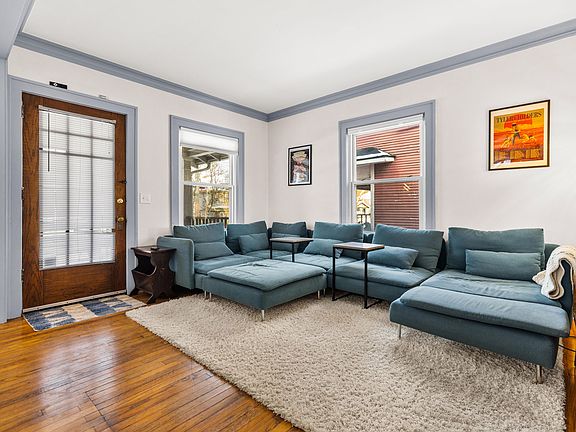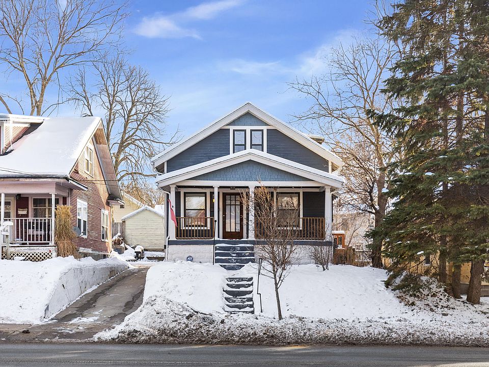 The living and dining rooms flow together beautifully, featuring hardwood floors and crown molding throughout, 4 large windows, and direct access to a spacious front porch. The kitchen, fully remodeled in 2019, features shaker cabinets, quartz countertops, teal glass subway tile, and stainless steel appliances. The main bedroom main bedroom boasts dual closets, built-in dressers, attic access for extra storage. There are two additional bedrooms, one on the main level and one upstairs that offer additional closet space. Full basement includes a washer and dryer and extra storage space.