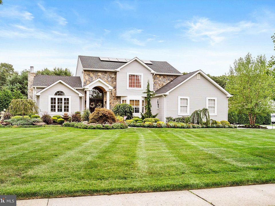 A step above the rest, this beautiful center-hall colonial located in desirable Plumsted Township is a must see! Boasting 2,900 square feet this home features 5 bedrooms, 3 full baths, 2 half baths, and a full finished basement. From the moment you drive up the Belgian block Cambridge paver driveway you'll be wowed! Paver walkway leads to the custom built imported Italian front door which opens to the two-story foyer. LVP laminate vinyl flooring flows throughout the home. To the left, find the living/family room with vaulted ceilings, new skylights, plenty of natural sunlight, and floor to ceiling natural quarry stone surrounding the gas fireplace. Anderson French doors lead to the deck. To the right is the formal dining room with crown molding and a large bay window. Through the foyer leads to the large eat-in kitchen with center island, subway tile backsplash, stainless steel appliances, double storage pantry, and an Anderson sliding door. First floor offers a laundry room, two bedrooms with 1.5 bath and separate entrance suitable for an in-law suite. Upstairs, three more bedrooms await including the master bedroom which has vaulted ceilings, walk-in closet with organizer, and large ensuite with double sink and soaking tub. Full finished basement offers an additional 800 SQF of living/work space with a ½ bath, office, playroom, and theater room fully equipped with custom surround sound, subwoofers and projector movie screen. Back deck overlooks the spacious fenced yard with firepit and 12x8 storage shed. Additionally, this home has whole house generator, a 20-zone sprinkler system, new roof with solar panels, New AC (downstairs) , Elec has been upgraded (main panel) to 200 amp, 150 subpanel, new gutters, freshly painted, offers an indoor/outdoor security system, and crown molding throughout. Meticulously maintained and stunning inside and out! This home won't last long, so schedule a private showing today! Note Septic is undersize for # of bedrooms. Solar panels are owned