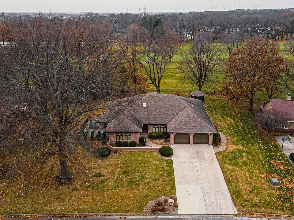 First class 2-3 bedroom, 3.5 bath all brick ranch (3200+ square feet on main level) situated on a 130X171 landscaped lot complete with a rear deck/gazebo, golf course views, and storage shed! Main boasts a gracious foyer with skylight, massive living/dining with cathedral ceilings and built-ins, fabulous rear family/sunroom, large front facing den, equipped kitchen/dining with center island/breakfast bar and solid surface countertops/tile backsplash, large laundry, hall half bath, massive master suite with gorgeous bath and walk-in closet, and a second large bedroom with an adjacent shared concept full bath. The mostly finished basement features a sitting nook, third bedroom (no egress), third full bath, rec room with built-ins/operable sink, tiled gym/craft room, mechanicals, and an enormous amount of storage space. Property also features a two car attached garage, generator, custom window treatments, zoned HVAC, whole house fan, Andersen windows -- premier property inside and out!