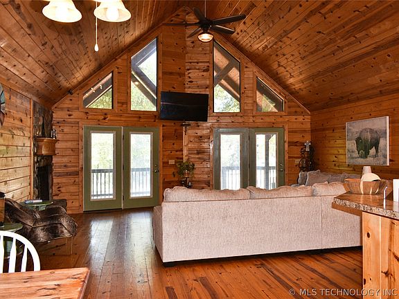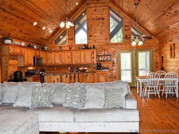 Beautiful log cabin on approximately one acre in gated Lakeside Ridge was made for entertaining or simply taking in views and sounds of Hugo Lake, wooded surroundings and small wildlife. Open concept main living space with soaring cathedral ceilings, knotty pine, and authentic hardwood flooring. Primary suite with lake view has French doors leading to the screened-in portion of the wraparound porch. Two guest rooms, one with private full bath and lake view. Oversized laundry room/bathroom combo. Included in the sale at no additional cost is a flat screen television and a cedar porch swing. Truly a must-see!