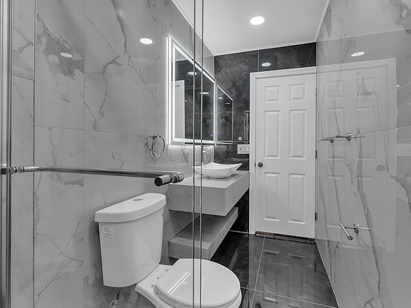 1 modern bathroom with marble-style tile, LED mirror, and sleek vanity