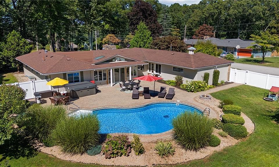 Thank you to all who attended showings and Open House! Please submit "Highest and Best" offers by 5:00pm Tuesday 9/10. Welcome to this charming mid-century ranch located in the heart of Greenville, Rhode Island. Spanning 2,447 square feet of open space, this home combines classic design along with modern comfort. The spacious layout offers plenty of room for both relaxation and entertainment. Featuring an updated open kitchen complete with granite countertops, large island, and stainless appliances. Boasting 4 bedrooms 1.5 bathrooms with red oak hardwood flooring throughout as well as oversized vinyl windows letting in plenty of natural light. Walk out of your sunroom to the massive 1600sqft paver patio where you can enjoy sunbathing and taking a dip in the beautiful 18x36 kidney shaped built-in saltwater pool, perfect for those warm summer days or hop in the 9 person hot tub and finish the night off with a seat around the fire pit. The nearly 3/4 acre lot is flat and vinyl fenced on a corner. The exterior features an architectural roof with Connecticut fieldstone walls and mid century details. Nestled in the desirable "Greenville Acres" neighborhood where you can enjoy an evening stroll around the block and a friendly wave from a neighbor. This home offers both tranquility and convenience, with easy access to local amenities and highways. Don’t miss out on the opportunity to own a piece of mid-century charm in a prime location!