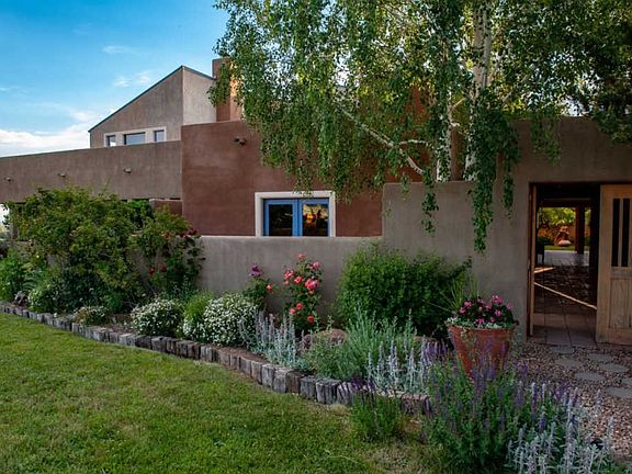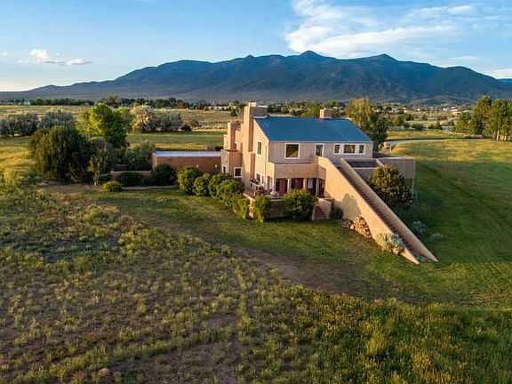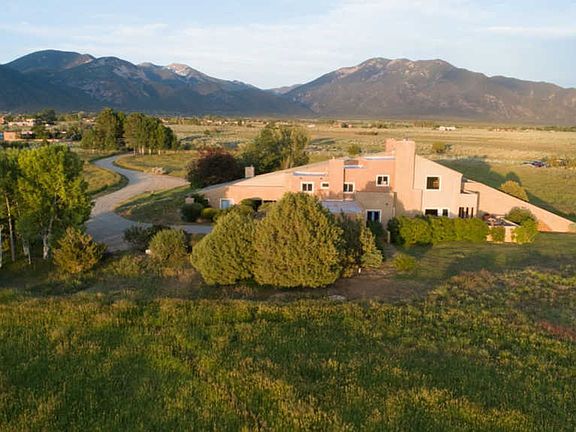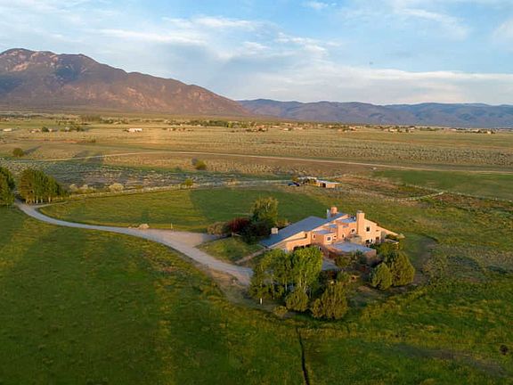 A slice of heaven is the best way to describe this magical 5600 sf house and guest house and studio. Designed by Architect Antoine Predock. Nestled on the vast plain of Des Montes and just down the road from Arroyo Seco and 15 min to Taos Ski Valley. The home sits on a 19-acre parcel and comes with 16 acre feet of water rights. There are staggering 360-degree vistas of endless sky and unparalleled views of the Sangre de Christos to the East, Pedernal and the geometric expanse of the western horizon and the snow-capped Truchas mountains to the south. These views will be yours in perpetuity. An adobe wall at the entrance provides a gracious envelope to draw one in from the vast expanse of surrounding land. You will be delightfully led through a honeysuckle covered trellis that leads you to the grand entrance of the home. This charming entrance is flanked by a beautiful fountain and charming guest house to the right. Once inside, you will be drawn by the stair case to the intimate and common areas of the space. The master bedroom, large living and den, and kitchen are all on the main floor. There is a 3,000 sq. ft covered portal surrounding the living and dining areas. The 35' ceilings in the living and dining areas are framed with enormous windows to preserve the feeling of an extension of setting and panoramic expanse. Upstairs you will find 3 bedrooms and a loft office and rooftop deck that continue to enchant. If you are looking for a safe place to live, this is it!