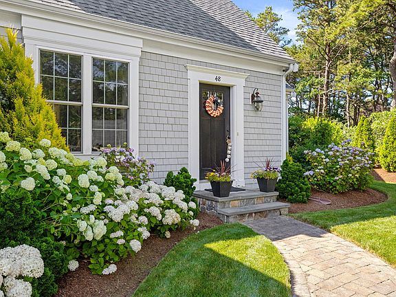 Beautiful 4BR 2.5 Bath Contemporary Cape with large heated 2 car garage , a custom outdoor fireplace and finished lower level. First floor main En-Suite bedroom with a custom tiled bath and large walk-in California closet and high ceilings.A gorgeous open kitchen/ great room with custom cabinets, rich wood flooring and granite countertops, a large center island, eat in dining area, spiraling cathedral ceilings, huge living room with a gas fireplace all overlooking the spectacular custom outdoor stone fireplace and patio area. There is also another guest bath, first floor laundry and a formal dining room overlooking the gorgeous front lawn and landscaping..Upstairs, 3 large BRs and another full BA along with a large unfinished area over the heated 2 car garage.. Central Air, whole house Generator, solar panels, on demand hot water and underground irrigation, A beautifully custom finished lower level that must be seen to be appreciated. Built in 2014, this impeccable home shows the loving care it has received. A very rare 4 Bedroom listing in the highly desired Seabrook Meadows Association located just up the street from the world famous New Seabury Club and South Cape Beach
