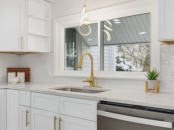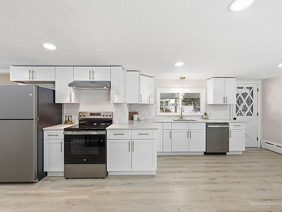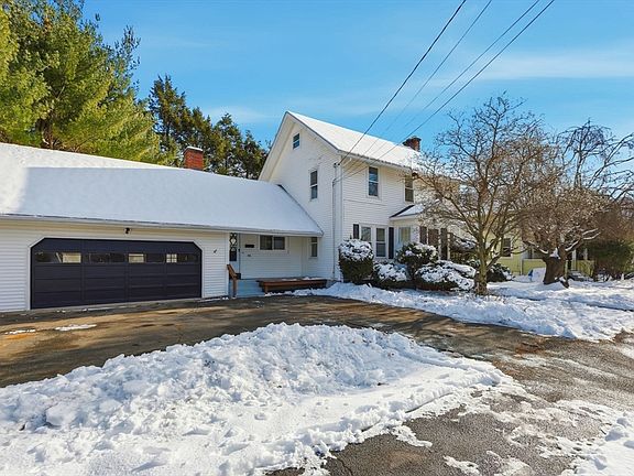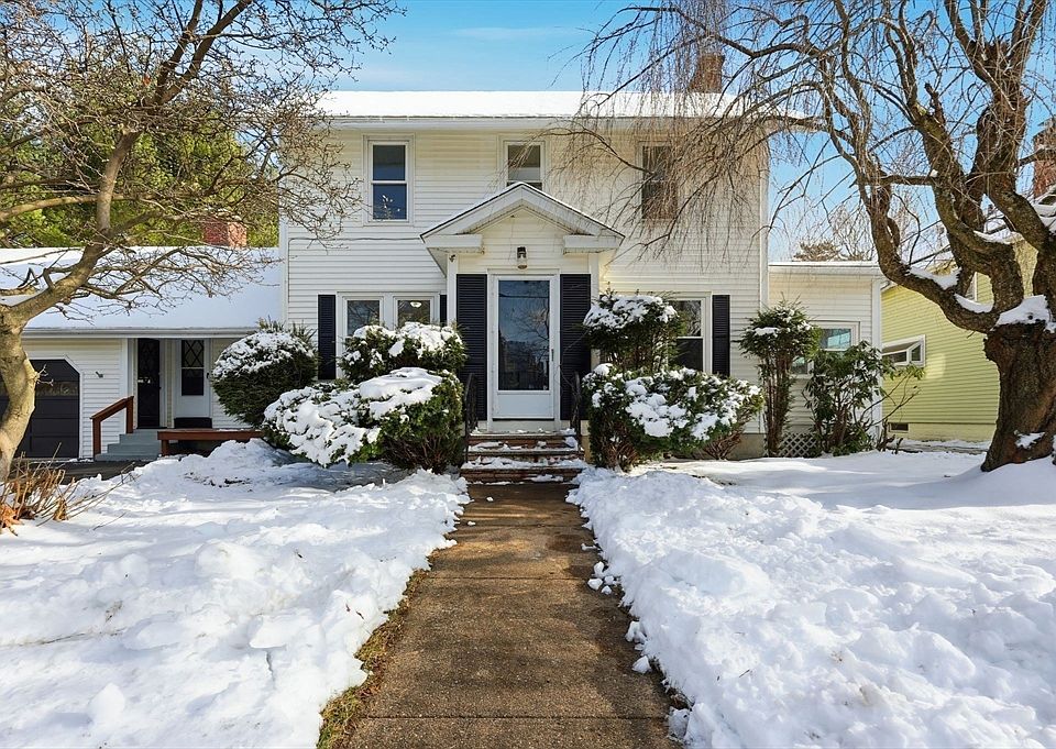 Beautifully remodeled Colonial featuring standout design and a refreshed layout throughout. The main level opens w/ a dramatic living room highlighted by a sleek fireplace & a striking custom ceiling installation w/ integrated lighting. Wide plank flooring and crisp trim work enhance the bright, open feel. The new kitchen offers quartz surfaces, white cabinetry, brass hardware, stainless appliances, modern lighting, & a fireplace display that adds an elegant focal point. A windowed dining area sits just off the kitchen, & sliders lead to a private yard.The first floor includes a room that can serve as a bedroom, guest space, or additional living area. A spacious family room with a vaulted ceiling expands the layout. A large mudroom w/ detailed trim & a dedicated home office completes the main level. The second floor features three bedrooms with new wall-to-wall carpet & a refreshed full bath. Additional highlights include a 2 car garage, NEW roof, updated lighting, & refined finishes.