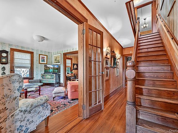 Ascend the stone steps to discover a c. 1880 home that seamlessly combines interior charm and functionality with an expansive outdoor living area. The wraparound front porch is an all-day oasis as you soak in the river views where bald eagles fly over sparkling blue waters framed by spectacular sunsets. Join with friends and family on the expansive rear deck, perfectly suited for summer gatherings, enlivened by a six-person hot tub and outdoor shower and surrounded by lawn and mature trees.