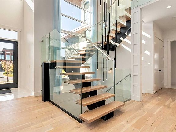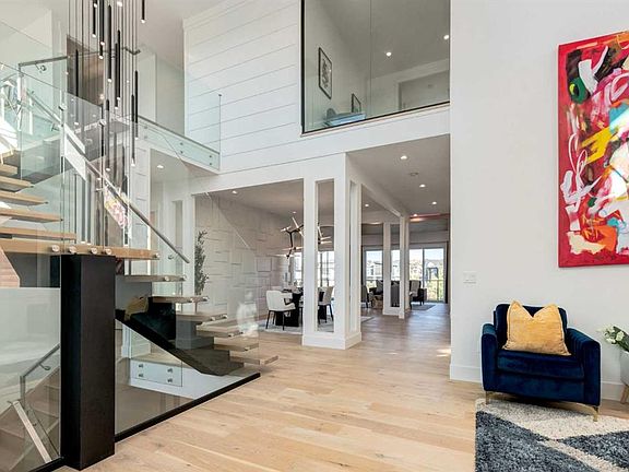 Welcome to this extraordinary WATERFRONT ESTATE in the prestigious community of WATERMARK AT BEARSPAW. Situated on a premium 0.29-acre lot backing onto a serene pond, this residence offers over 7,000 sq ft of luxurious living space with 7 bedrooms, 6.5 bathrooms, and two master suites, including one on the main floor. Designed with elegance and functionality in mind, the home features soaring 10-foot ceilings, 8-foot doors, an open-to-above foyer, and extra-wide hallways, all contributing to a grand and airy ambiance. A neutral color palette is paired with refined finishes such as engineered hardwood flooring, built-in speakers, heated flooring, and 12mm glass features throughout. The heart of the home is a stunning chef’s kitchen equipped with premium Thermador stainless steel appliances, a gas cooktop, quartz countertops, a spacious central island with a built-in banquette, and a separate spice kitchen or butler’s pantry. Adjacent to the kitchen is a formal dining room with a custom feature wall, a large family room with an upgraded linear gas fireplace, and a dedicated home office. The main-floor master suite includes a luxurious 5-piece ensuite, a generous walk-in closet, and private access to a serene outdoor patio. Upstairs, the primary suite offers a true retreat with a double-sided gas fireplace, an opulent 5-piece ensuite, an oversized shower, a walk-in closet with a custom island, and its own private patio with waterfront views. Three additional bedrooms, two with ensuite access & walk-in closets, while the upper floor also includes a bonus room with tray ceilings, a sleek glass-enclosed library, and a full laundry room with a sink. The walk-out basement is an entertainer’s dream, featuring a spacious recreation and games area, a wet bar, an elegant wine cellar, and a beautifully designed home theatre with a second wet bar. This level also includes a glass-walled gym, two large bedrooms, a full bathroom with a steam shower, and access to a future hot tub area. Outdoor living spaces include an upper deck with an outdoor theatre (wired for heaters & Motorized screens), and a lower concrete patio, all with spectacular water views. Additional highlights include a fully finished quad garage with extra storage and heater rough-ins, walk-in closets in all bedrooms with custom MDF shelving, dedicated laundry on each floor, double furnace, tankless water heater, water softener, and central vacuum system with multiple vac pans. Located on a quiet, central street in Watermark—an award-winning estate community—this impeccable home combines thoughtful design with premium features and finishes. One of the premier homes on one of the most desirable lots in the community makes this property a must-see if you're looking for luxury living at its finest!!! OPEN HOUSE SAT. OCT 4TH 2:00-5:00 & SUN OCT 5TH 1:00-4:00!!