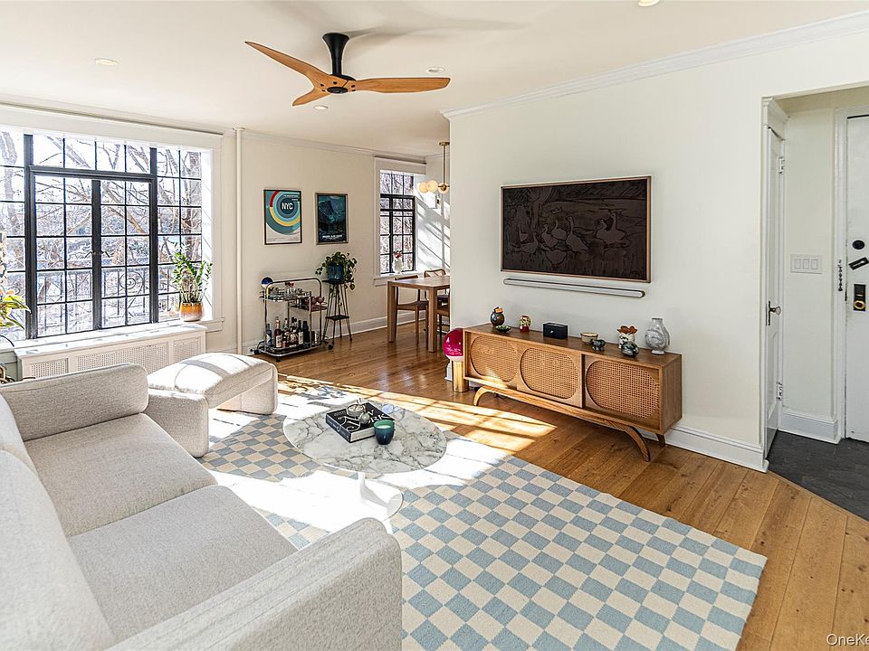 Eye catching and magazine worthy, this thoughtfully renovated 2 bedroom one bath pre war coop at lovely Gramatan Gardens enjoys beautiful oversized south facing windows and the best open plan kitchen design for chefs and guests alike. From its new character grade white oak flooring in the large living area to its top of the line stone countertops and ultra high end appliances in the adjoining kitchen, the vibe here is uber sophisticated, yet abundantly comfortable and charming. The bedrooms both enjoy the best California closet designs for maximum functionality. The primary bedroom features 3 large closets, one which serves as an optional tucked away WFH desk area. The designer bath with new vanity, new toilet and handsome tilework is stunning. All of this plus great reconfigured closets, an assigned parking space, free storage and a super easy walk to town, train and school. Pets welcome too! The total package for easy on foot village living!
