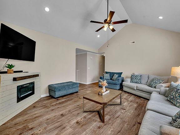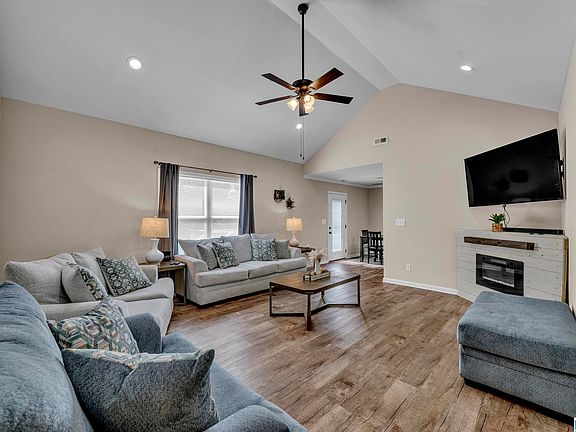 The moment you step into this beautiful home with vaulted ceilings, an abundance of natural light and luxury vinyl plank floors throughout you will be ready to make it yours. The master bedroom and spare bedrooms are nicely tucked away from the living area for privacy. Entrance from the garage conveniently leads to the directly to the kitchen with a large laundry room and great space for additional pantry. Step out of the kitchen onto a nice large deck - perfect for entertaining, watching the kids play or your relaxation time. Enjoy family time in your den with the cozy fireplace. Maintenance free, move-in ready and almost new, sure to check all your boxes! Make plans to see this one before it gets away.