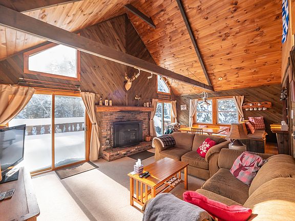 Owner will consider offers. Unique opportunity to own an updated and woodsy chalet just up from the slopes of Mt Snow, yet also with direct snowmobile trail access. This 5 bedroom, 2 bath home has been tastefully renovated while maintaining the charm and character befitting a Vermont retreat ski home. The interior features an open concept living space with vaulted great room, wood burning fireplace, natural woodwork and great light thanks to large windows, a kitchen off one side with live edge breakfast bar and stainless appliances, ample dining space open to the large front deck for outdoor enjoyment or potential future hot tub apres ski, there is a main floor bedroom and full updated bath, a second floor loft bedroom, two guest bunk rooms in the lower level, a second full updated bath with tiled showed, and a large fifth bedroom that doubles as a family room with fireplace. There is also a mudroom addition great for gear storage and getting out of the cold, a large shed for gear, ample parking, and tons of privacy. Less obvious upgrades include a standing seam metal roof, updated windows and doors, updated flooring throughout, and more, for easy turn key enjoyment or incredible rental potential thanks to the style and mountain proximity. There is direct VAST snowmobile trail access from the private level property, so you can ski half day and snowmobile the other half, without ever having to drive far.