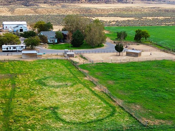 The layout of the horse facilities is set up with precision and functionality. Hay barn, irrigated pastures with 4 animal shelters and feed rooms. Round pen, riding arena, obstacle trail and track. 3 stall barn with runs, tack room, wash rack and training rack. Additional features include livestock pen, fenced garden area, chicken coop, fenced in dog run with lawn and shade trees.