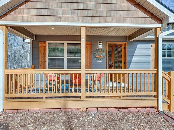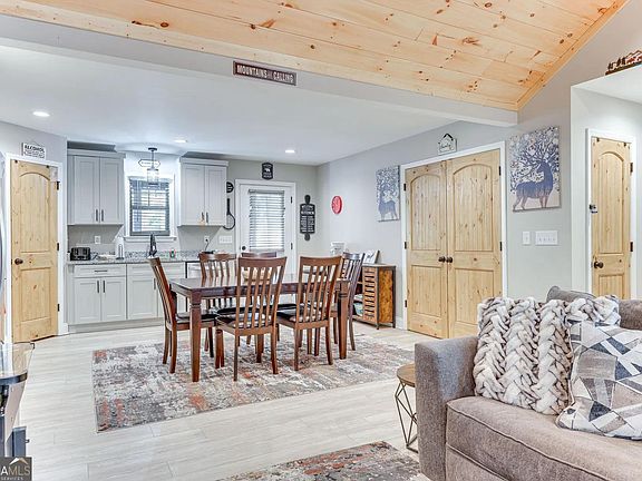 Situated in the gated Coosawattee River Resort in Ellijay, Georgia, this 2022-built cabin offers approximately 1,200 sq. ft. of living space on 0.58 acres with three bedrooms and two baths. An open floor plan welcomes you with soaring beamed ceilings in the great room and a stone gas fireplace. Vaulted tongue and groove ceilings and ceiling fans are featured in the primary suite and guest rooms and living area. Durable vinyl plank flooring runs throughout, and the kitchen features granite countertops and Whirlpool stainless appliances including a range, dishwasher, refrigerator and over the range microwave. There is also a kitchen pantry, dining area, laundry closet with washer and dryer.