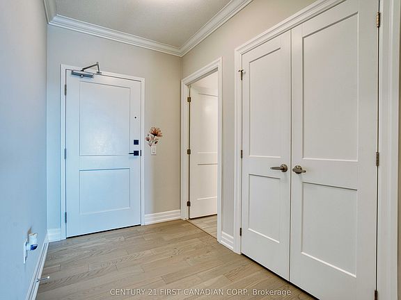 Gorgeous property located in the desirable Sunningdale community. This sixth floor one bedroom + one den model offers1080sqf living spaces plus 80sqf balcony with the great viewings of the pond and trail. Carpet free. Engineer hardwood throughout the unit. Contemporary style kitchen upgraded with quartz countertops, backsplash and powerful rangehood. Livingroom combined with dining area and fireplace. Spacious primary bedroom has large windows and walk-in closet. Two bathrooms upgraded as well. This unit owns one underground parking spot and MAIN level locker. Amenities such as Fitness room ,Golf simulator, Residence lounge, sports court and a guest suite are in this building. Close to Masonville Mall, UWO, hospital and public transit. It is suitable for the first-time buyers or young couples. You will love it.