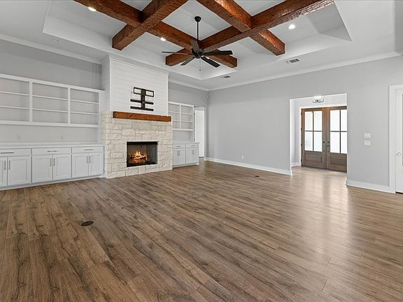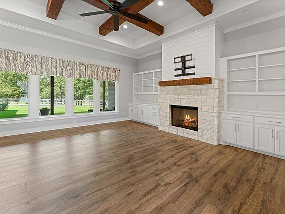 Step inside to a spacious living area with faux wood beams with remote ventless fireplace and built in shelves. The chef’s kitchen features dual ovens, an oversized island, abundant cabinet and countertop space, a large walk-in pantry with coffee bar and glass-front display cabinets—perfect for entertaining and everyday living.