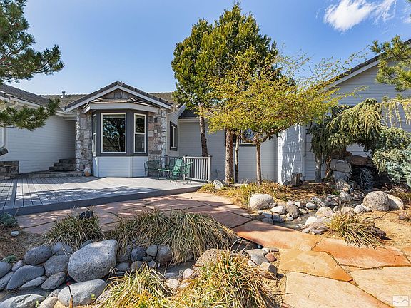 Discover your ultimate private retreat w/ this stunning home on 2.5 acres, w/over 2,800 sf of main level living, this unique residence stands out w/ its exquisite custom river rock details creating a one-of-a-kind aesthetic. Enjoy an additional 728 sf of finished walkout basement and cozy book loft w/ a view, all perfect for relaxing or hosting guests. The outdoor living space is a true oasis, featuring a cozy fireplace, a serene fishpond, & brand-new hot tub all set against a backdrop of spectacular views!, Car collectors or hobbyists will appreciate the expansive 5-car garage, complete with 220v workshop and convenient half bath. Experience the Zen of multiple water features, including cascading waterfalls and tranquil streams that meander through the property. This extraordinary property offers a seamless blend of comfort, luxury, and nature, making it the perfect sanctuary for those seeking a harmonious lifestyle. An ideal location that offers the best of both worlds—just moments from all the excitement and amenities of city life yet tucked away enough to enjoy peaceful evenings and dark skies untouched by city lights. Here, the stars truly shine, putting on a spectacular show every night. All of this, just minutes from the stunning shores and slopes of Lake Tahoe.