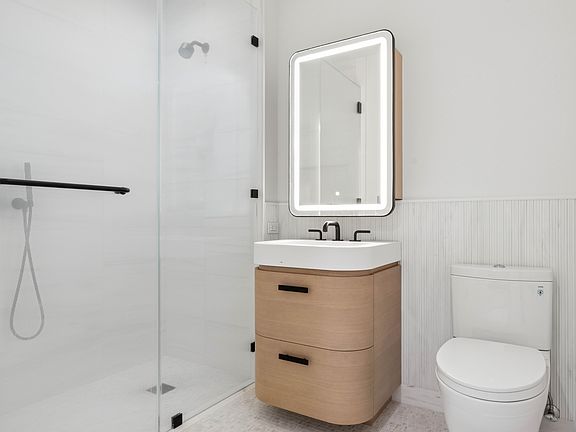 The spa-like full bathroom is adorned with honed Carrara marble mosaic tile floors, a custom floating vanity with curved corners, a custom medicine cabinet with integrated LED lighting, and a walk-in shower. A large reach-in closet and a laundry closet with a stacked washer and dryer complete the home.