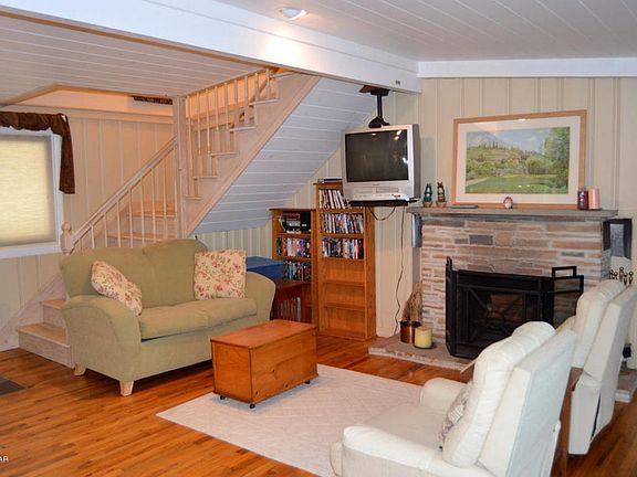 Lakefront home with massive entertaining deck overlooking Lake Wallenpaupack. Gentle slope to the lake with Y shaped dock. Master suite plus 3 more bedrooms,a total of 3 baths and cozy livingroom with stone fireplace. Eat in kitchen with sliders out to the partially covered deck. Most furnishings are included in this gem, ready for you to move right in and enjoy the summer!!!
