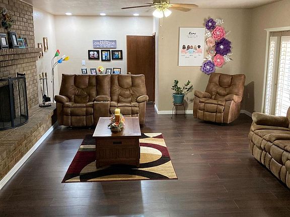 Beautiful 2, 010 sq. ft well kept home located in Fabens, TX. This home features ceiling fans throughout the home, storm windows shutters, granite bath vanity and refrigerated air. Open kitchen and dining area large family room that includes a fireplace and backyard accessibility front yard is concreted in for family gathering. Home includes an open covered car pad and room for RV parking. Home has a small workshop with electrical power and plenty of storage. Home is close to schools and has easy accessibility to freeway.