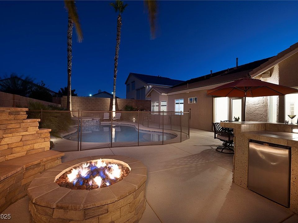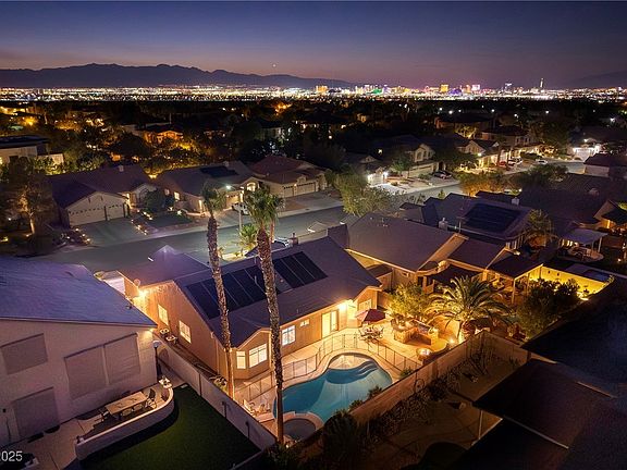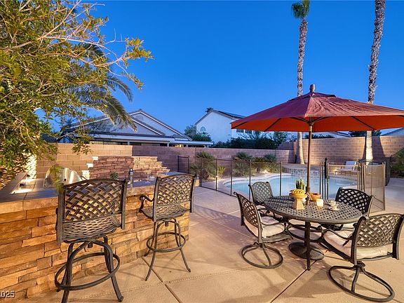 Introducing The Palm Villa House. 1-Story. Open Entertaining Showcase the Warm & Inviting Finishes T/O. 2026 SF, 4 Bed, 2 Bath, 3 Car, .16 Acres. Sensational Outdoor Grounds w/Solar Heated Pool & Spa, Built-in Outdoor Kit-BBQ w/Bar Seating, Fire Lounge, Dog Run & Mature Palm & Canary Landscaping. Striking SS Kit-Granite Counters & Bar Seating. Statement Stone Wall w/3-Way Fireplace. Living, Dining & Family Rooms. Oversized Primary Suite w/Spa Bath-Separate Tub, Shower, Dual Vanities & Walk-in Closet. Large Picture Windows Flood the Home w/Natural Light. Spacious Laundry Rm w/Cabinetry, Washer & Dryer. Security System w/Surveillance Cameras. Fresh 2-Tone Paint, Ceramic Tile T/O, Water Softener, Shelving in Garage, Hayward Cleaning Vacuum, Pool Fence. Unbeatable Green Valley Location -5 Mins to Whole Foods, Dining, Shops, Zoned for Top-Rated Schools. Nevada is a State WITHOUT Individual, Corporate, Estate or Inheritance Taxes offering significant savings for Residents.