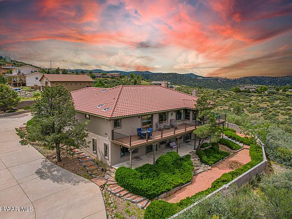 Discover this stunning remolded mountain retreat with no HOA. Nestled on 2.36 acres, this 4-bedroom 4 bath home offers panoramic views from Trex decking, 3 car garage and epoxy floors. Inside, you'll find new bamboo flooring & luxury vinyl tile & a kitchen featuring granite countertops. The open floor plan flows seamlessly into a cozy living room. 2 fireplaces. Both primary suites boast of their own private balcony. Additional bedrooms are generously sized, offering ample space for family or guests. Basement en suite offers huge bonus area and wet bar. The sizable lot offers endless possibilities for landscaping and outdoor activities. This property provides easy access to Prescott's vibrant downtown and outdoor recreational opportunities. Make this mountain-view oasis yours. Easy to show