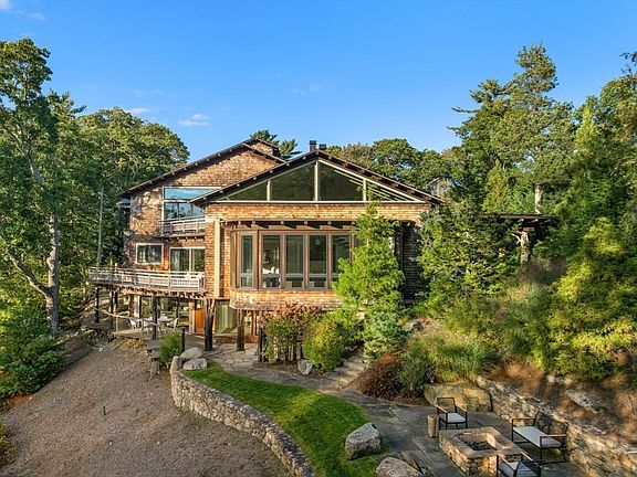 Welcome to The Treehouse at Wales Pond — a breathtaking 8,000+ SF custom-built sustainable retreat, privately set on 2.83 acres along the water’s edge. This architectural masterpiece fuses Japanese and Spanish influences with organic materials and pond views from nearly every room. Expansive glass walls open to sun-drenched terraces, effortlessly merging indoor and outdoor living. Every space embodies intentional design from the vaulted great room with custom steel fireplace and floating staircase, 1st floor primary suite with Smart Glass solarium bath, and tranquil Yoga Studio with Tatami mats. This home offers 4–6 bedrooms, 6 full baths, a spacious media room, lofted library, and a full in-law suite on the lower level with private entrance. Outdoors, a heated pool & jacuzzi, yard, fire pit & pizza oven overlook Wales Pond, while private trails through abutting conservation land lead to the Village of Marshfield Hills. A true sanctuary ideally located minutes to the Atlantic Coast.