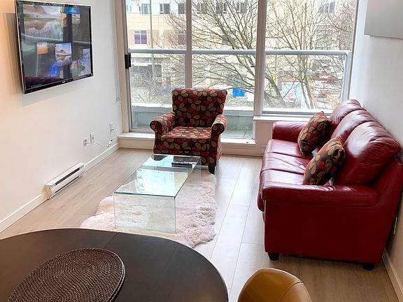 Features: Blackout+Sunshade blinds for privacy, High ceilings (10'2 ), Furniture (including adjustable standing work desk), 55 Flat-screen TV (wall-mounted), Laminate/tile flooring, Stainless steel appliances, In-suite laundry, Portable air conditioning, Den, Balcony, Granite counters, Fresh paint