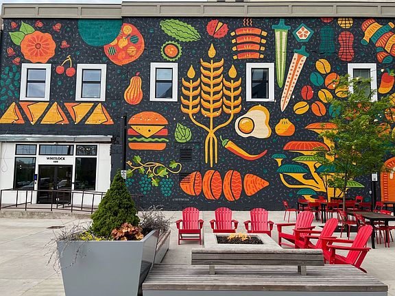 Exposed brickFire pitStainless steel appliancesFood vendorsCoffee shopGrocery storeGranite countertops