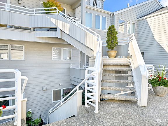 Unobstructed Bay, Island and Mountain views from this South Hill luxury waterside condo overlooking premier Boulevard Park. Enjoy the ever-changing scenery - sailboats and sunsets from your generous deck. Spacious lower patio with direct access to a grassy lawn. Updated finishes with Corian counters, Travertine tile accents, crown molding + Oak site finished hardwood floors. Open concept design. Entertainer's kitchen. Living room with a gas fireplace. Primary ensuite with spa-inspired finishes and view deck. Laundry room with storage. 2nd BR on main. Lower level: family room with wet bar, workshop space with sink and 3rd BR. Private garage + uncovered parking space. Easy walk or bike ride to historic Fairhaven + gorgeous waterfront trails.
