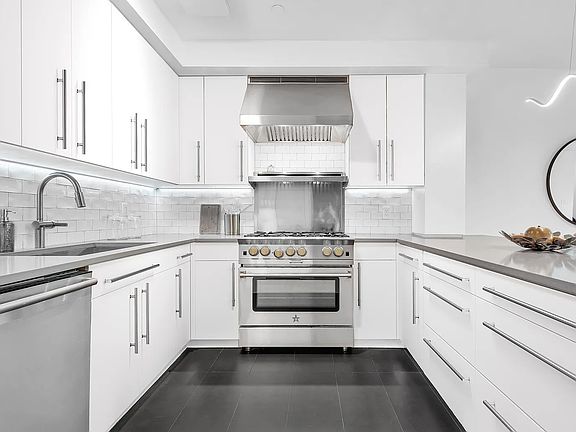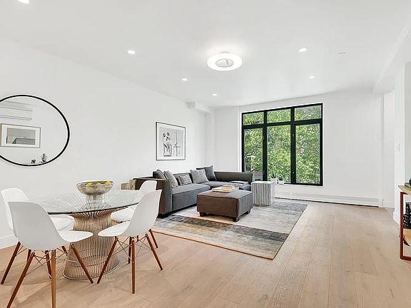 The beautiful open-concept living and dining room affords an elegant modern backdrop, with brand new lovely white oak flooring throughout and a fully renovated kitchen, an entertainer's dream. Finely renovated and tailored to the chef, the stunning kitchen shines with all refaced kitchen cabinetry, plus a pantry, 6-burner Blue Star range, 36-inch LG Refrigerator and Bosch dishwasher for easy cleanup. Also on this level are two bedrooms, beaming with natural light, plus California closets. Off one of the bedrooms is a lovely South-facing balcony, perfect for a morning coffee. There is a brand-new washer and dryer tucked away in laundry room with extra room for storage, plus a gut renovated bathroom all on the main level.