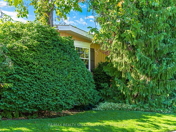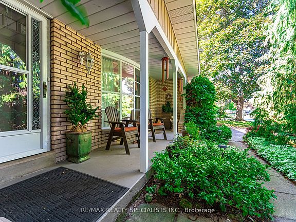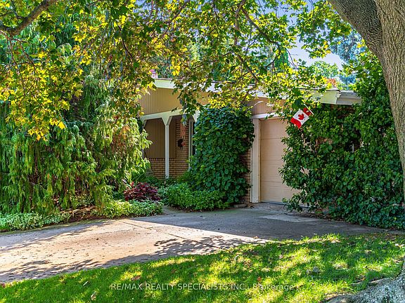 A rare garden sanctuary with multiple enclosed sunrooms and several distinct outdoor living areas. The unique corner lot is wrapped in towering cedars, evergreens and deciduous trees that create complete privacy across the covered front porch, the sunny rear deck with a natural-gas Weber hookup, and the window-lined sunrooms that open to the yard. Inside, hardwood floors and crown moulding set an elegant tone. The living rooms bow window frames the front porch, while the dining room, finished with California wood shutters, overlooks lush greenery. The kitchen blends function and style with granite-transformation counters, refinished oak cabinetry, a ceramic backsplash, a movable butcher-block island and pantry, plus quality stainless appliances including a GE Café induction range, a new Elica hood fan with exterior-vent option, a Bosch dishwasher, and a Miele fridge. One sunroom features a gas fireplace and direct access to the garage. The 5-piece main bath offers hexagon-pattern tile, a separate shower, and a long vanity. Bedrooms include custom, interchangeable closet systems with mirrored doors. The lower level features a large recreation room with a French-door entry, expansive windows, panelled walls, and a gas fireplace with a full brick surround, along with a fourth bedroom, a 4-piece bath, and a versatile gym finished with vinyl plank flooring. Enjoy a short walk to Nelson Park, Nelson High School, and Pauline Johnson Elementary (ranked the number-one elementary school in Burlington), with quick access to bike paths, trails, Paletta Lakefront Park and Mansion, the lake, local shops, GO, QEW, and the 407.